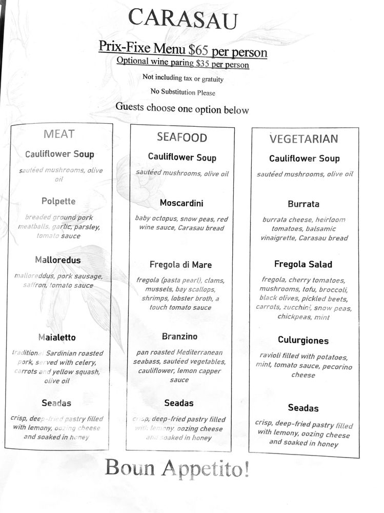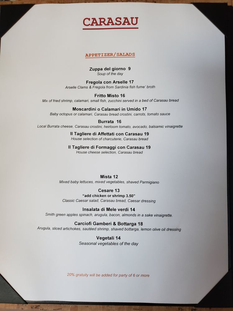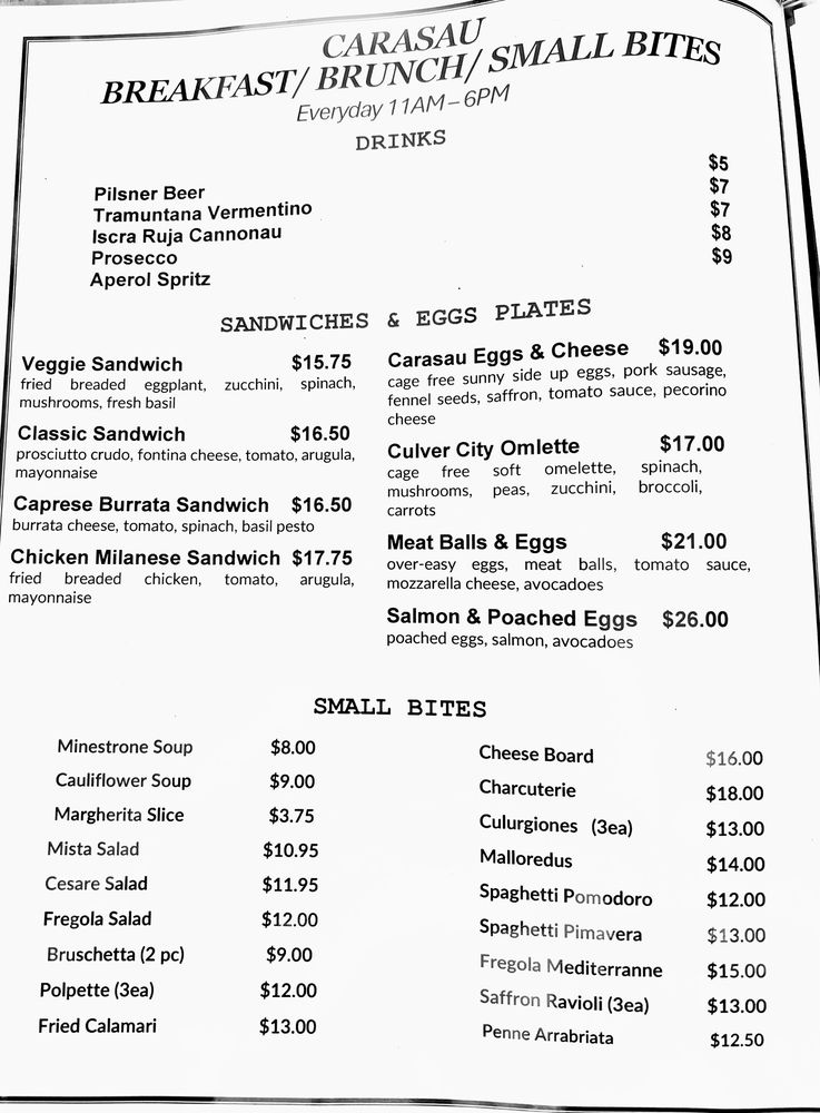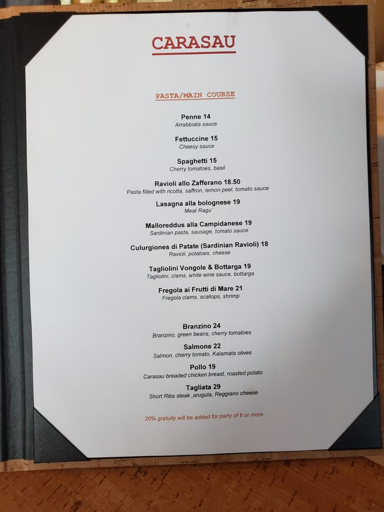 Carasau, a charming Italian restaurant with a Sardinian flair, offers a variety of dishes ranging from pastas to main courses. The ambiance is intimate and the service is top-notch, with attentive and knowledgeable servers. Customers rave about the delicious and perfectly seasoned focaccia bread, crispy Sardinian bread, and authentic Sardinian dishes like lasagna, ravioli, and fritto misto. The menu also includes options for pescatarians, vegans, and limited vegetarians. The roasted pork and saffron ravioli are particularly praised for their flavors. With a diverse wine list sourced from Sardinia, Carasau caters to wine enthusiasts as well. Whether you're stopping by for brunch, lunch, dinner, or dessert, Carasau promises a delightful dining experience with its delectable dishes and welcoming atmosphere. Experience the taste of Sardinia at Carasau in Culver City.